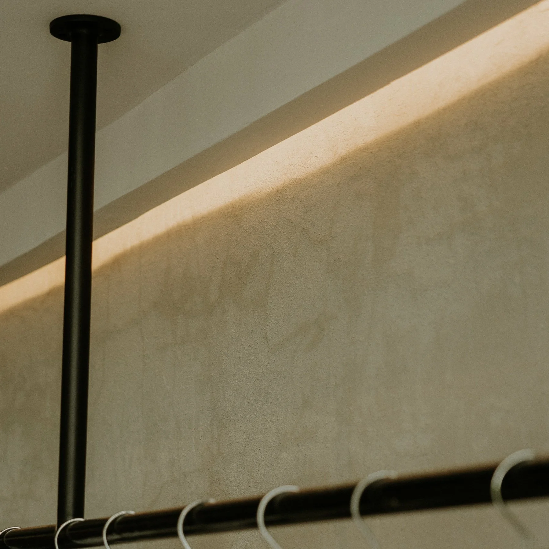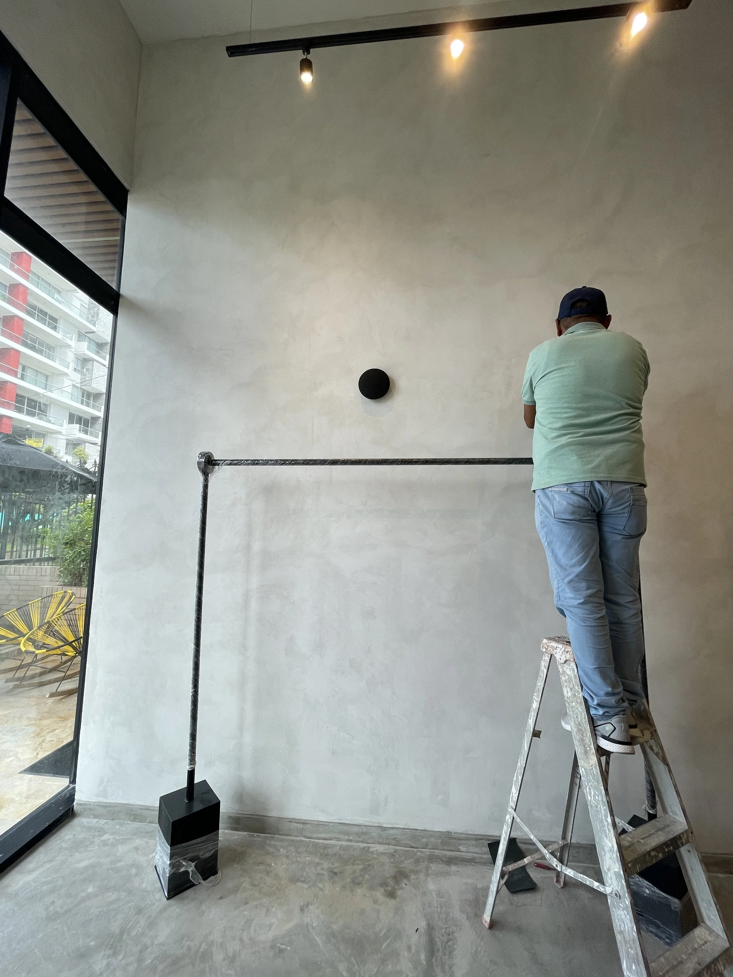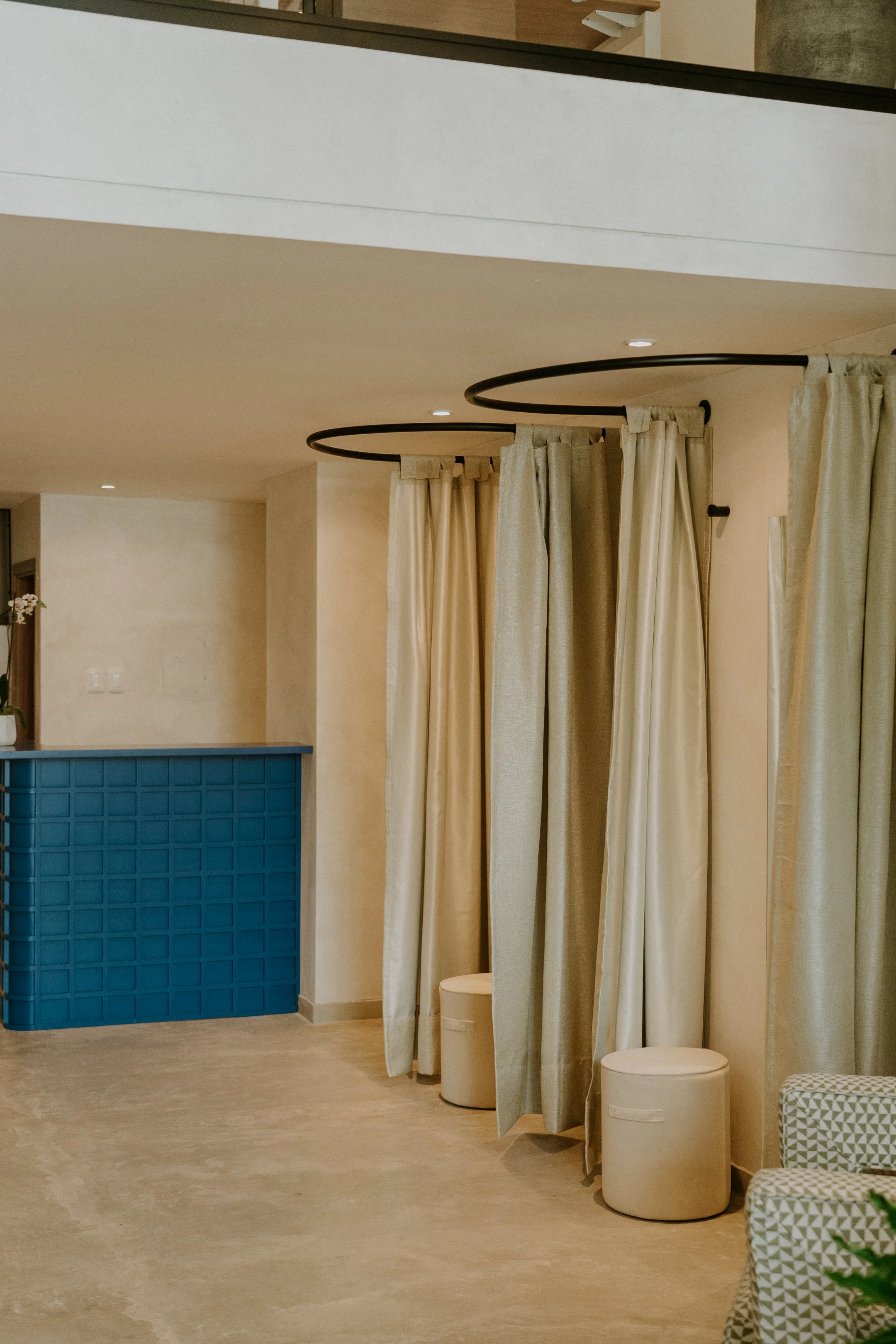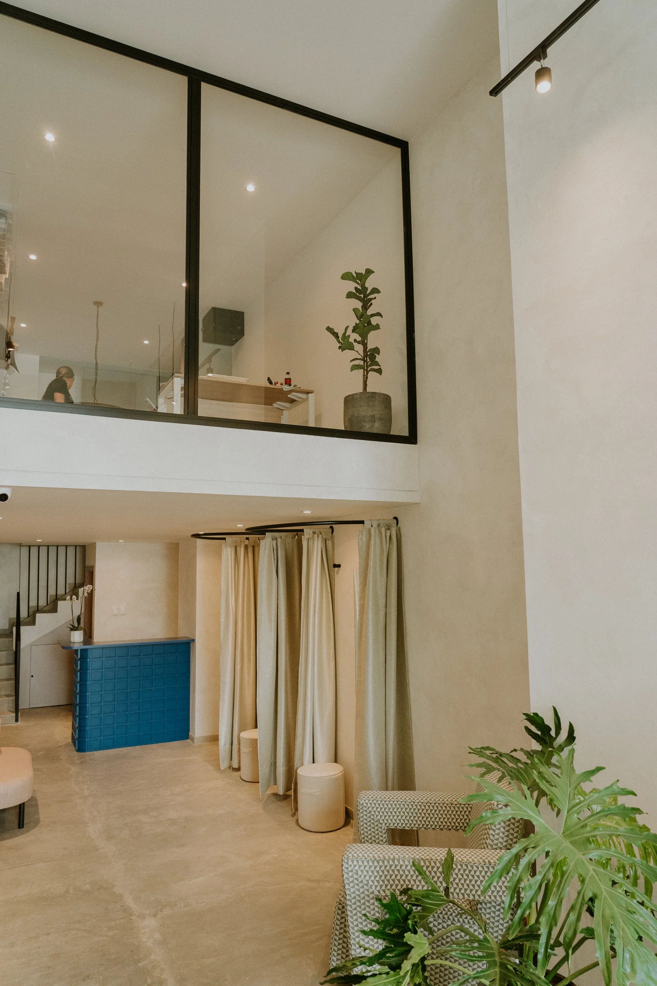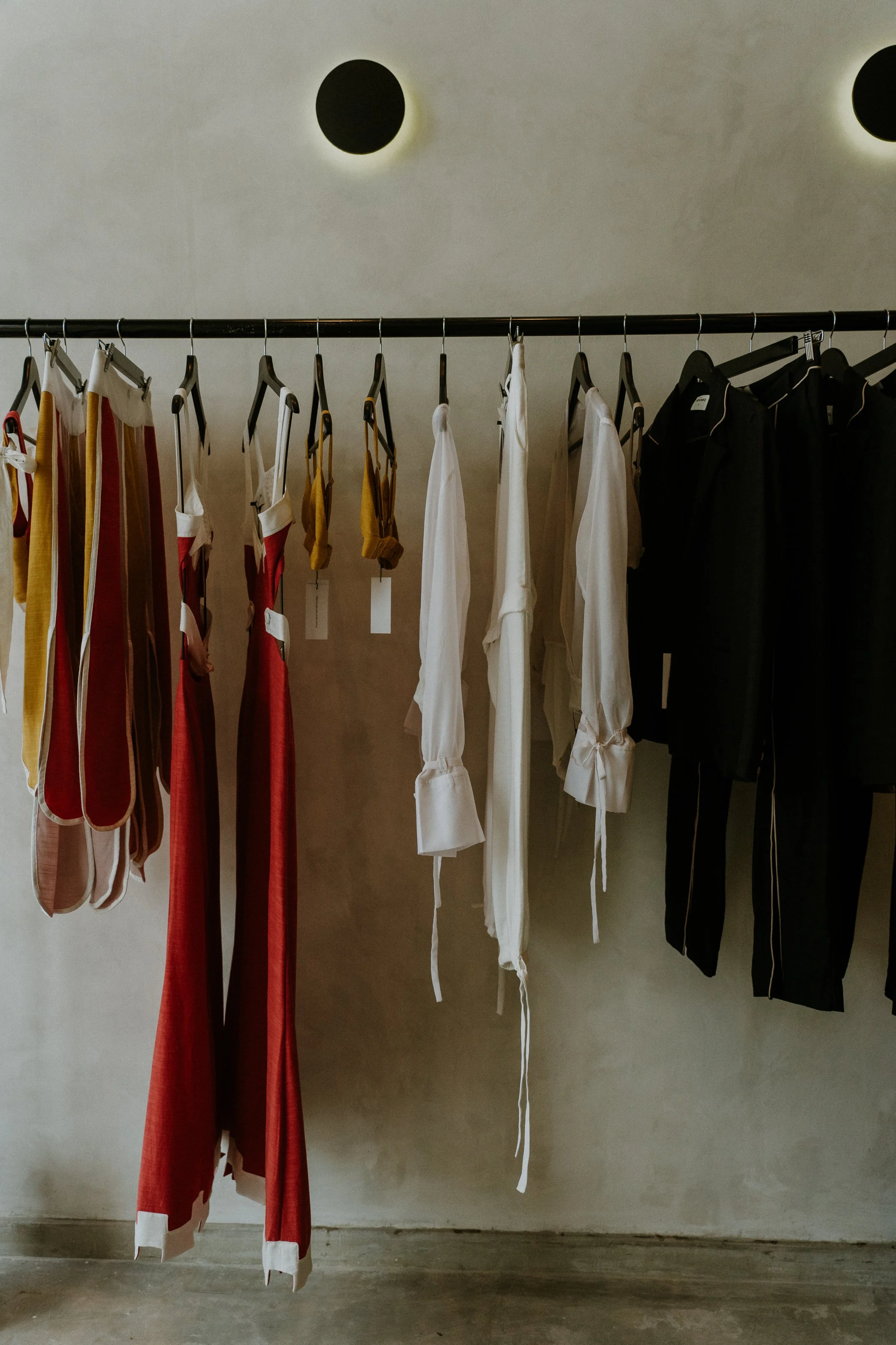 Las superficies expuestas de acabado en microcemento o “limewash” y los acabados metálicos aportan una estética moderna y cruda, creando un fondo ideal que realza los colores, texturas y formas de la ropa. La iluminación juega un papel crucial, iluminando cada prenda de forma estratégica para atraer la mirada del cliente y resaltar los detalles únicos de cada diseño.